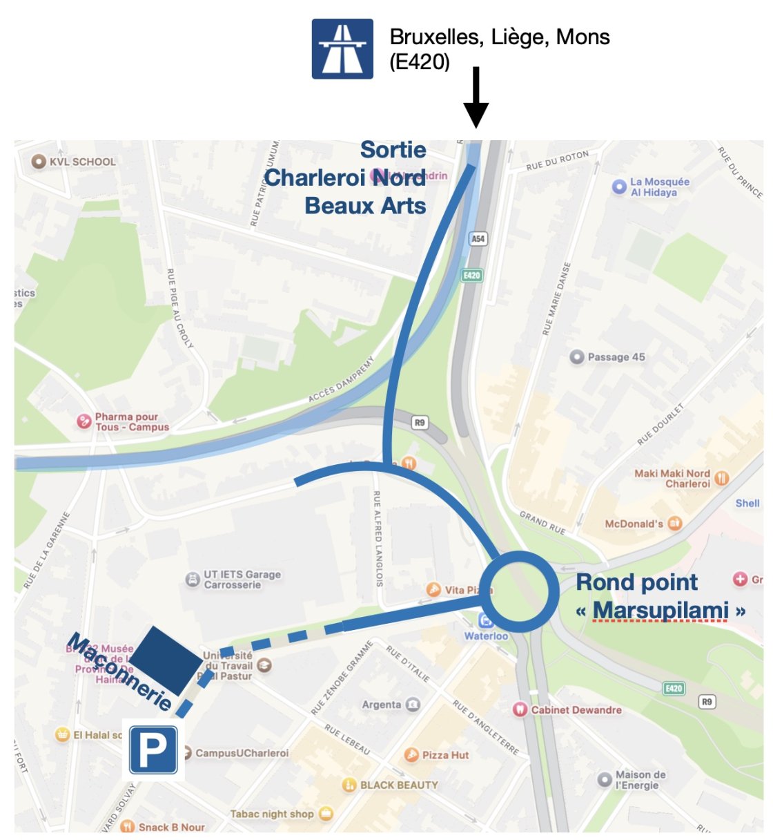 En voiture. Voir plan ci-dessous. Parking souterrain (payant) sous le boulevard Solvay, accessible par la trémie depuis le rond-point Marsupilami (première sortie du rond-point en arrivant de l'autoroute)